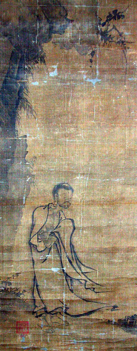 中幅の出山釈迦図については、印章、作風とも、可翁の作であるとする説と、時代的には、初期水墨画