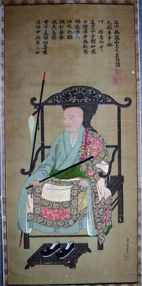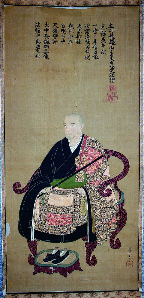江戸前期のすぐれた頂相画である。描かれた僧は、貫十梵通が 法幢寺二世、大中梵発が法幢寺三世で、共に