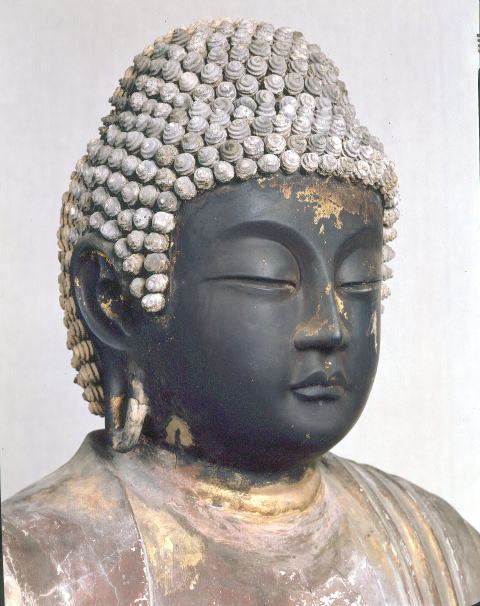 【時 代】 奈良時代(頭部) 【像 高】 85.3cm 【材質 構造】 頭部: 脱活乾漆造 体部: 寄木造(後補) 彫眼 漆箔 【備 考】 頭部の製作には、脱活乾漆造技法が用いられており、乾漆造特有の柔和で若々しく、張りのある表情をもつ。奈良時代中頃、いわゆる天平様式の優れた作風をよく表しており、東大寺関係の作例と共通性が多いことから、官営造仏所(造東大寺司の造仏所)で造られたと考えられている。