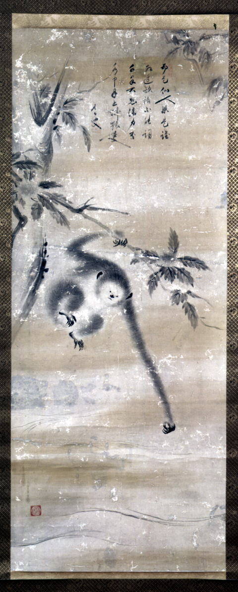 枯れ木の描写には力強い筆の運びが見られる。また、水に写る月を捉えようとする猿は、
