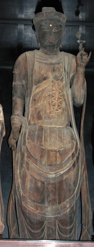 厳しく神秘的な独特の表情を持ち、膝下部には翻波式衣文がみられ、平安時代初期の特徴を残す。