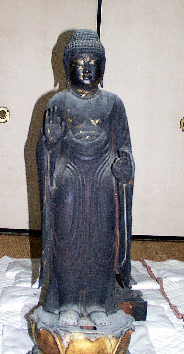 【時 代】 平安時代前期 【像 高】 105.0cm 【材質 構造】 ヒノキ 一木造 彫眼 漆箔 【備 考】 丸みを帯びた量感を持つ体部に、翻波式衣文がみられ、 平安時代前期の特徴をしめす。
